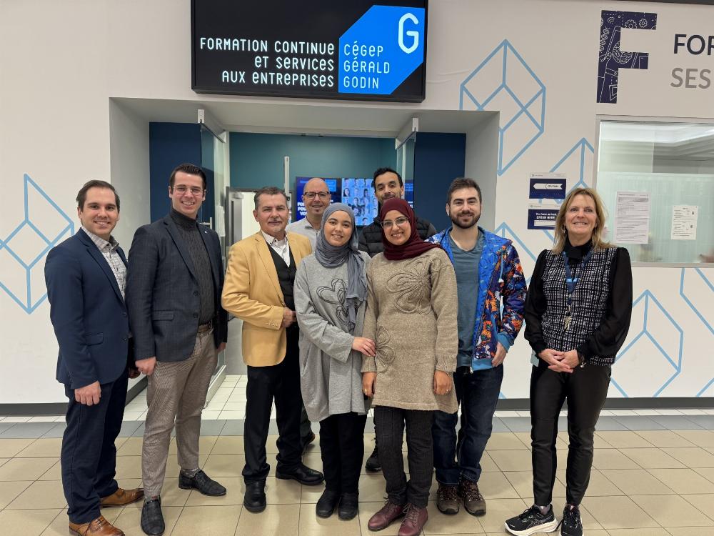 De gauche à droite : Pascal Turcotte, directeur des ressources humaines et des communications au Cégep Gérald-Godin ; Karl Bédard, directeur principal à Valkartech ; Serge Rioux, fondateur et PDG de Valkartech ; Cristian Pamfiloiu, coach au programme, Sana Asma Titi et Ichrak Ounissi, finissantes au programme ; Fahmi Kahlaoui et Jérémy Arsenault-Lavoie ; finissants au programme ; Nathalie Clusiau ; conseillère pédagogique et responsable du programme