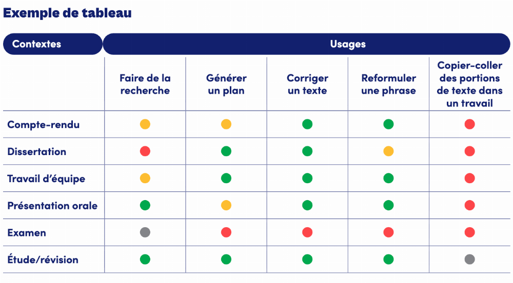 On voit de plus en plus, dans les universités, l’utilisation de guides de déclaration de l’utilisation de l’IA. On doit déclarer, dans les thèses, les mémoires et les travaux, l’utilisation qui a été faite de l’IA pour la recherche, la rédaction, la correction et la traduction.