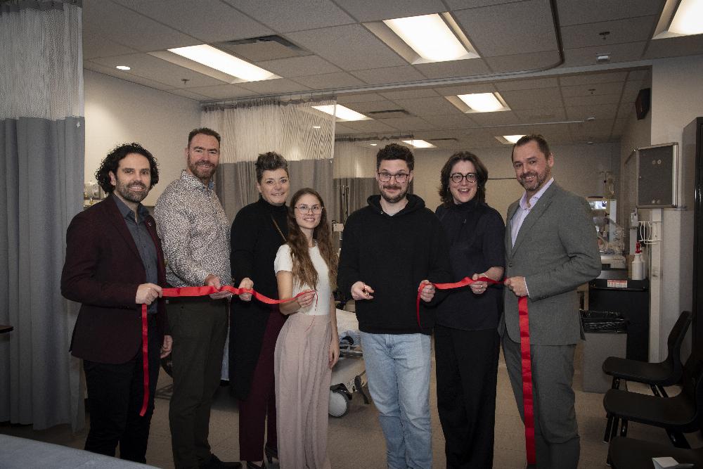 Coupure du ruban en présence de nombreux partenaires internes et externes. De gauche à droite : David Marra-Hurtubise, représentant de la députée de Les Plaines - Lucie Lecours, Joël Bouchard, directeur de la Fondation du Cégep de Saint-Jérôme, Patricia Tremblay, directrice des études, Frédérique D’Amours, enseignante en Techniques d’inhalothérapie, responsable à la coordination du programme et des stages, Kevin Brisebois, étudiant en Techniques d’inhalothérapie, Nadine Le Gal, directrice générale et Xavier-Antoine Lalande, maire de Saint-Colomban et préfet de la MRC de La Rivière-du-Nord.
