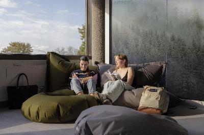 En plus des nombreux espaces de travail, la bibliothèque possède également un lieu dédié à la détendre, un projet mené en collaboration avec les services psychosociaux du cégep. « L’Espace détente, c’est une pièce vitrée avec un décalque dans les vitres pour rendre l’espace plus intime. Il y a plusieurs chaises zéro gravité, des grands poufs pour s’allonger ainsi que des livres sur la détente, la méditation et la santé », explique Aglaé Duhamel-Dubé.