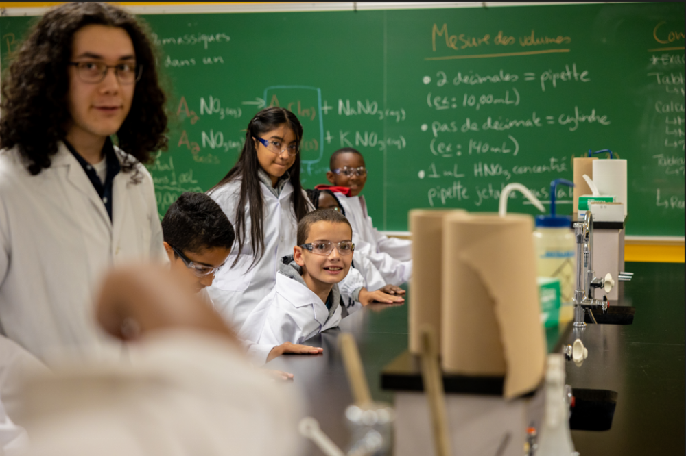 Mentor et élèves prenant part à un atelier d’éveil scientifique dans un laboratoire du cégep.